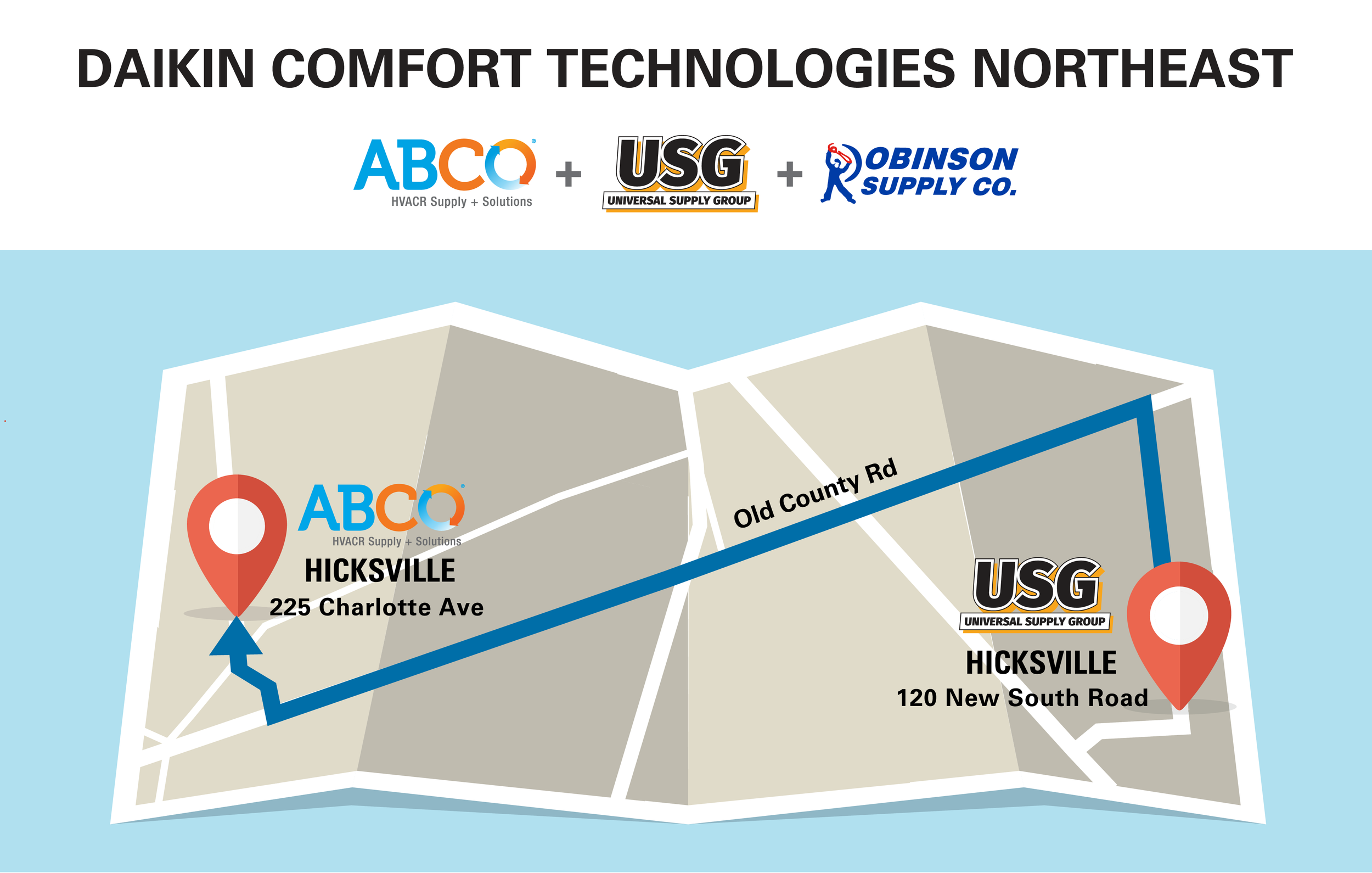 Daikin Comfort Technologies Northeast has unified ABCO Hicksville and Universal Supply Group Hicksville at the ABCO location to better serve you with one stop shopping at one convenient place